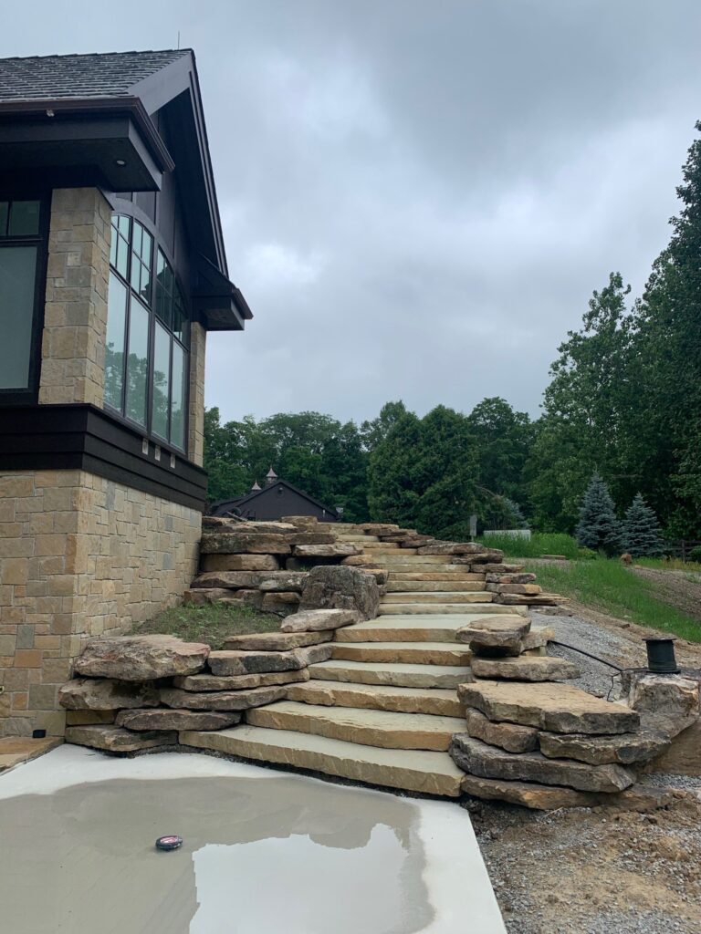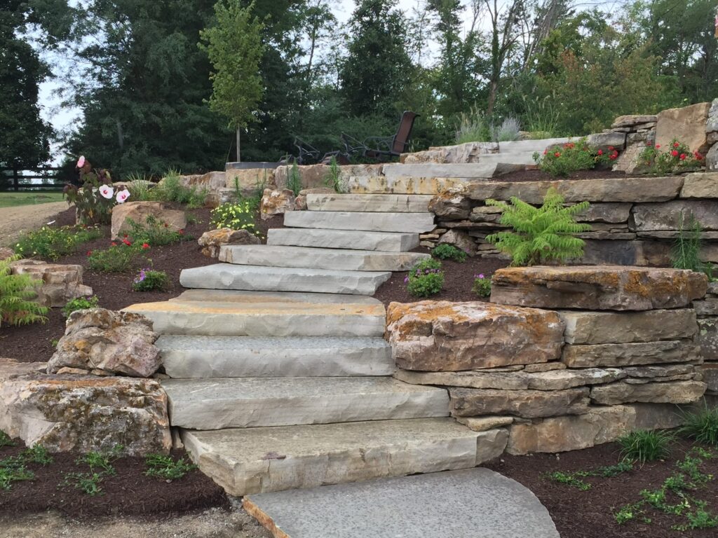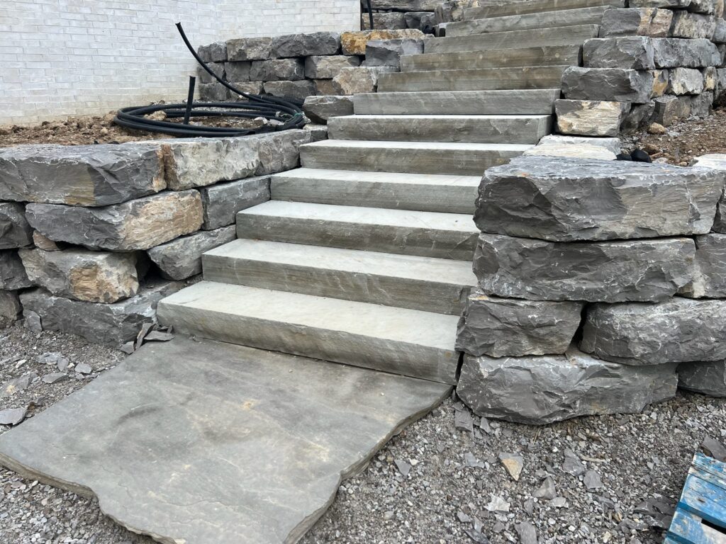 Okie Blue 4′ Snapped Steps are thick-cut natural stone pieces featuring cool blue and gray tones with clean, split edges. Their 4-foot length provides strong visual presence and dependable structural support, making them ideal for stairways, grade changes, and formal landscape transitions. Okie Blue Brown 3′ Snapped Steps feature a blend of blue, gray, and warm brown tones with defined snapped edges. Designed for landscape stairways and elevation changes, their 3-foot length offers flexibility while maintaining durability and a balanced, natural appearance.